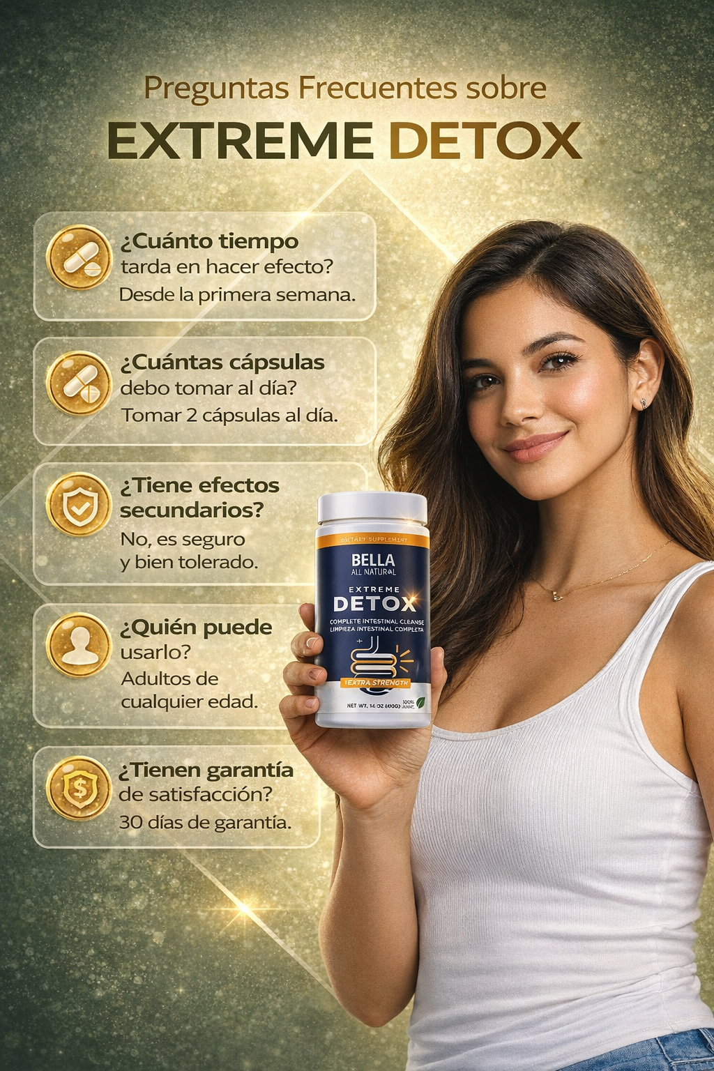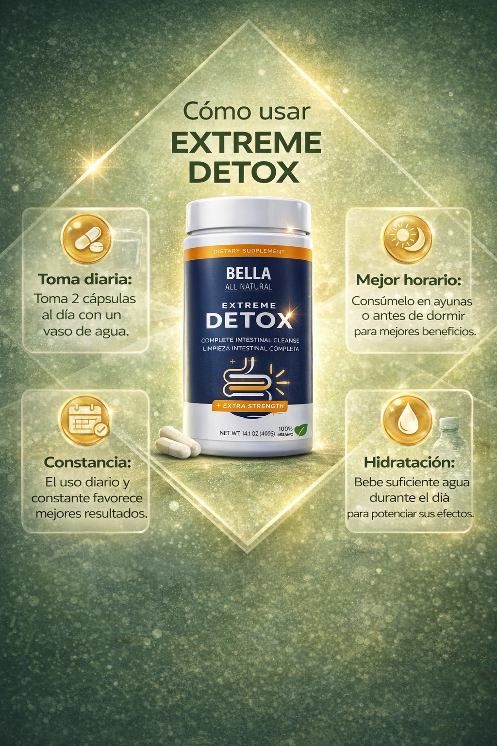 Bella Detox contribuye a una mejor digestión y limpieza intestinal, ayudando a eliminar lo que tu cuerpo ya no necesita.
