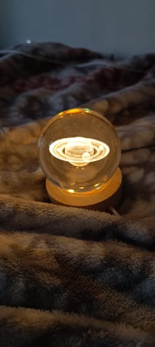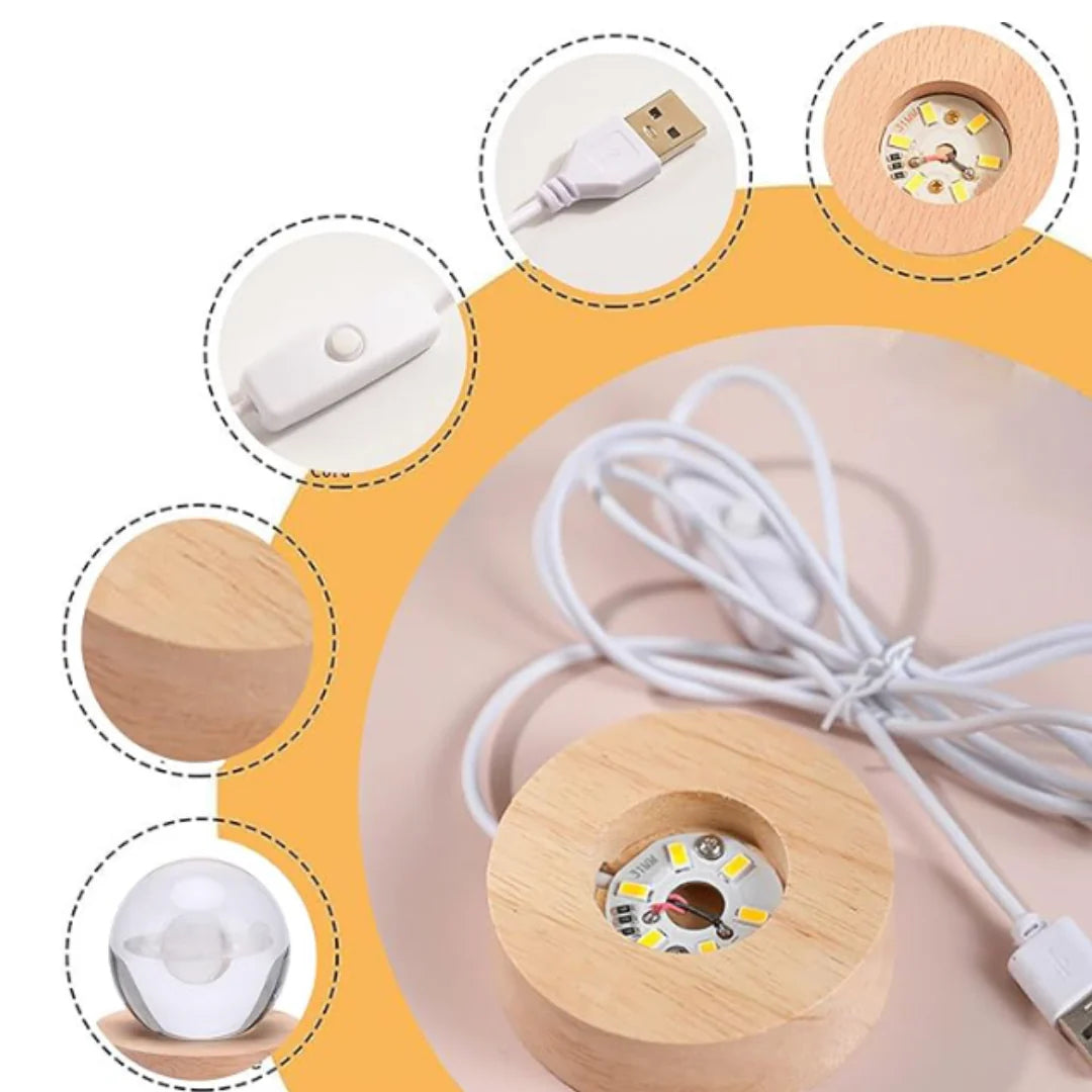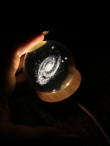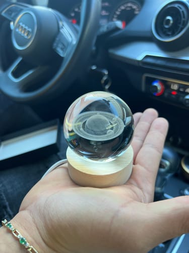 Todas nuestras esferas son de cristal muy resistente e incluyen una base de madera luminosa con conexión USB y un interruptor integrado y con grabado láser 3D.