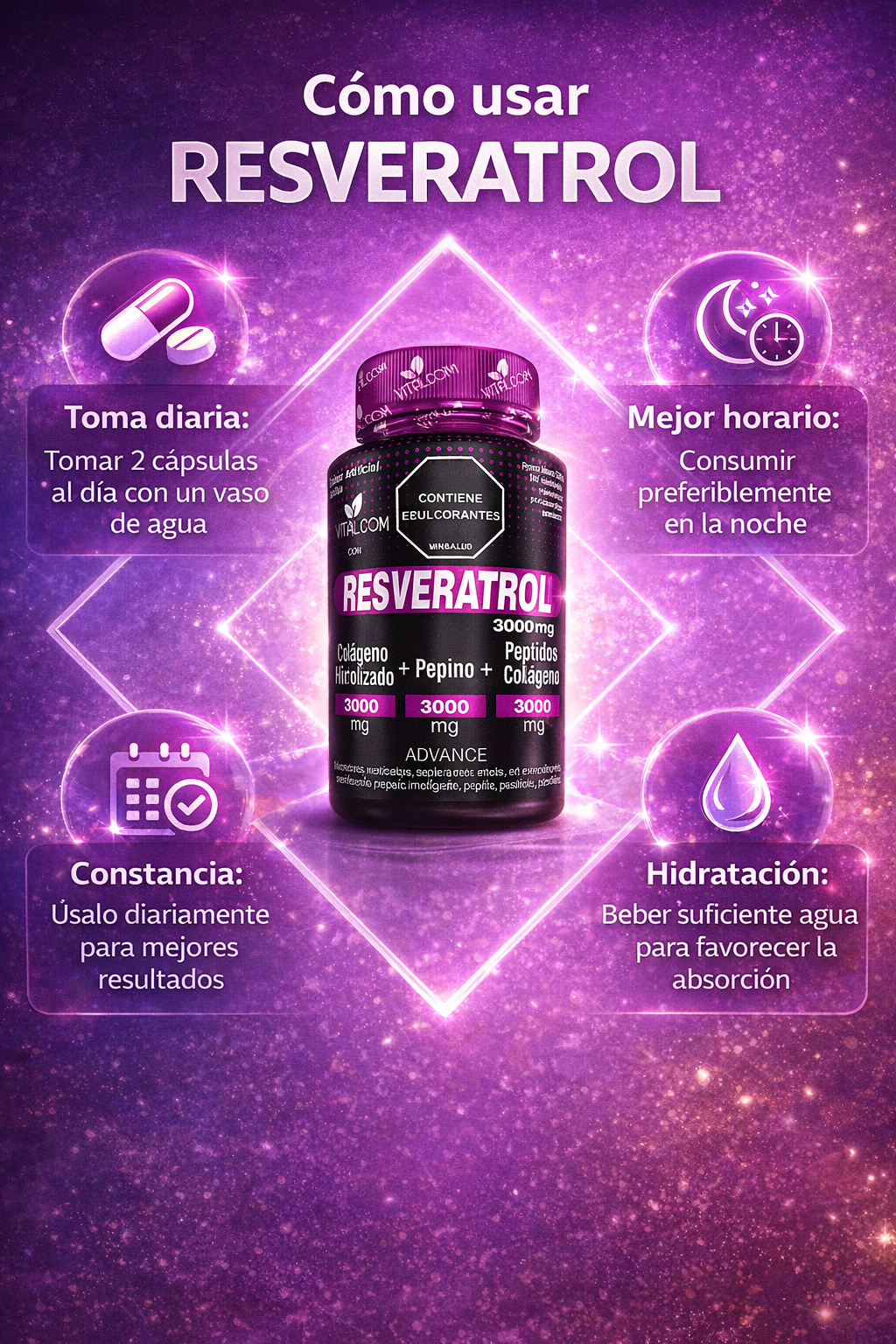 El resveratrol aporta antioxidantes mientras el colágeno apoya la firmeza y elasticidad natural.